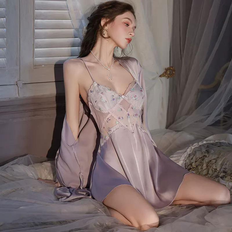 2025 Satin Kimono Robe & Lace Trim Nightdress Set